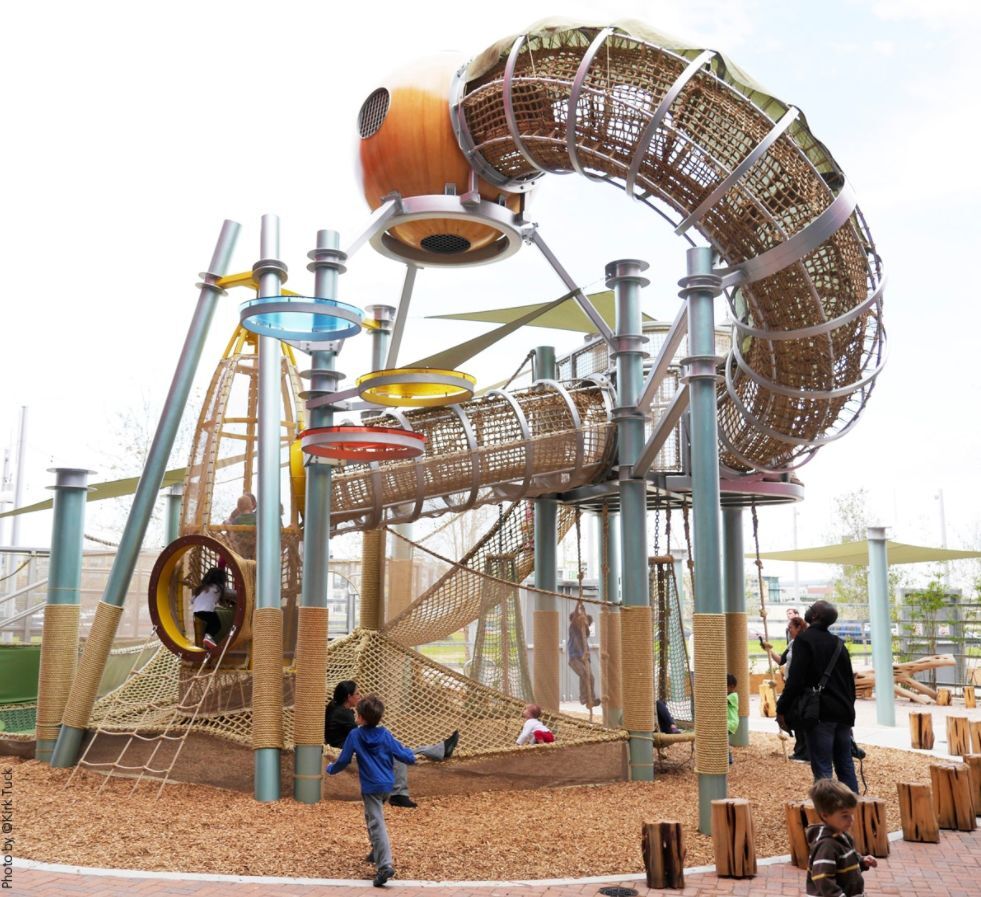 该公园的一个主要目标是“重新思考游戏”,并研究游戏活动如何成为增加社交互动和建立社区的工具。在保护和庆祝历史悠久的树木的想法的推动下,设计师在树林中创造了标志性的游戏体验,其500英尺长的高架“玩家连接器”人行道沉浸地进入树冠。