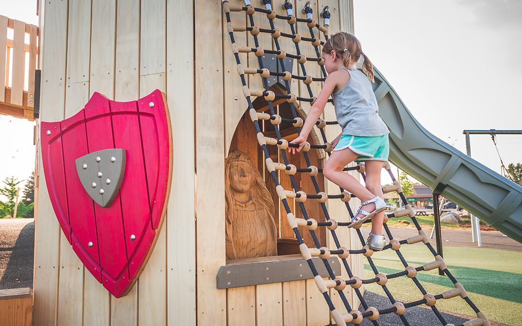 其他手工雕刻的橡木雕塑为异想天开的游乐场故事增添了深度和特色。农场动物,乌龟,公主,巫师和宝物箱遍布现场和城堡内。主题公共艺术元素将儿童吸引到叙事中,鼓励创造力并激发想象力。