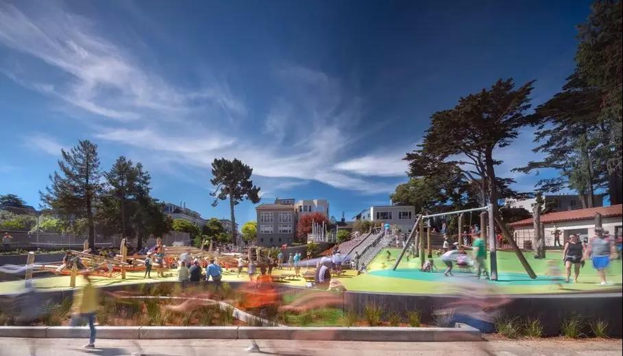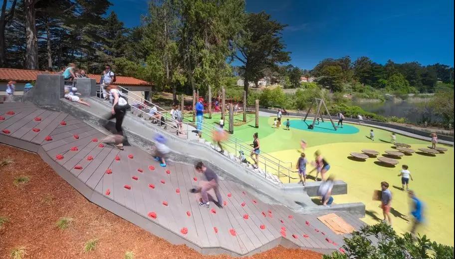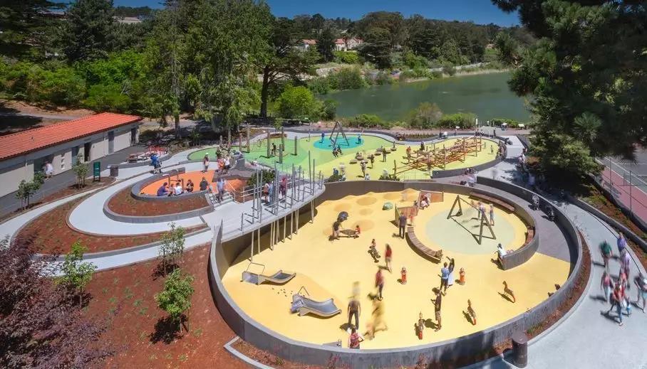 山湖公园游乐场位于美国旧金山里士满区,新设计的方案与其周边环境无缝衔接,形成了一种游乐场原本就在这里并且一直会在的感觉。