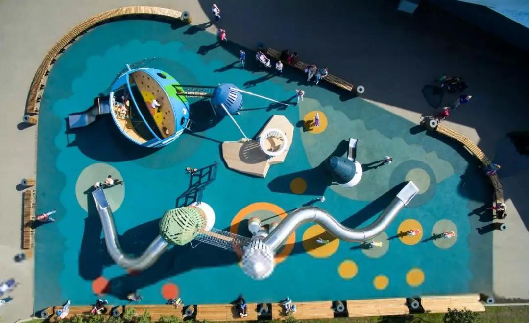 项目场地全部铺设这彩色泡沫海绵,踩上去舒适且安全。同时,公园大草坪的南端也设计了停车场和一些公共基础设施,根据地形所打造了不锈钢滑梯,合理利用空间,在滑梯两边设置攀爬设施,增加体验感。