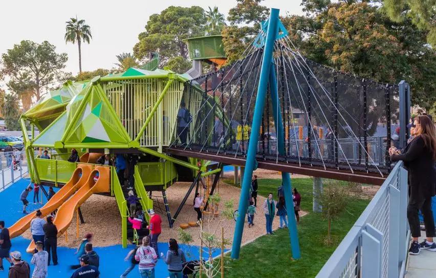 穿过公园巨大的开心果、翻滚的松树和高耸的棕榈树,“游乐连接器”像高架桥一样即发挥了鸟瞰公园又为游客提供了遮阳避暑的功能,多层次、多元素的游乐设计鼓励了孩子之间的即兴互动。