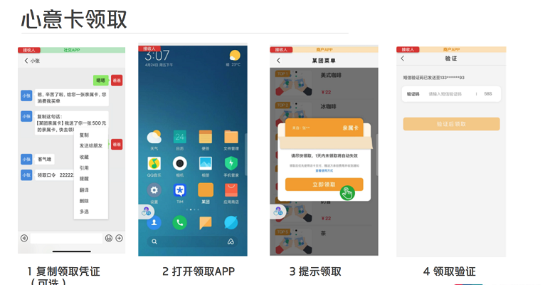 在整个业务流程中,银联的心意卡券服务(TSP)通过TSM,全渠道分别向赠送端和领取端提供服务。赠送端一般为银行App,银行App也可以作为领取App。而如果领取App为垂直电商,则可以衍生出多种应用场景。