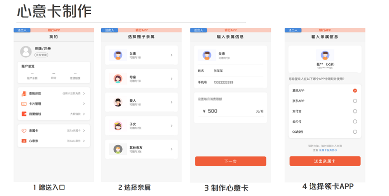 “心意卡券”分为两类产品,一类是心意卡,其主要是将银行卡额度分享有亲密关系的家人,设置月消费额度上限,家人需要实名认证并领取使用;另一类是心意券,其主要是将部分授信额度分享给其它用户使用,通常额度较小,类似于红包,使用范围也受限,目标是替代提货券或兑换券。
