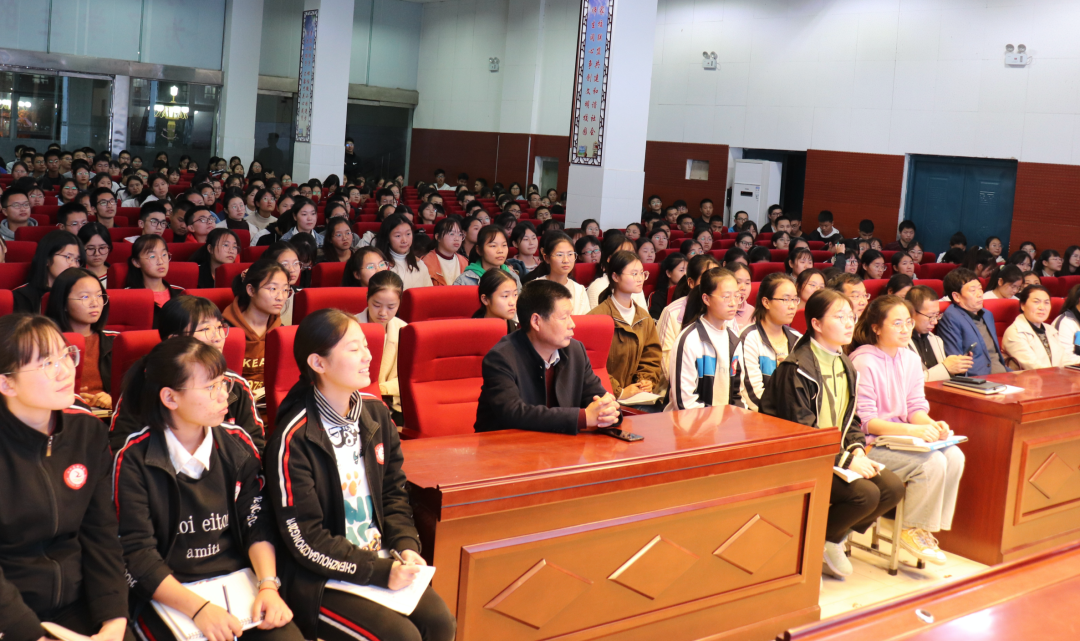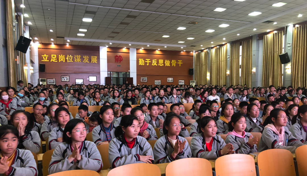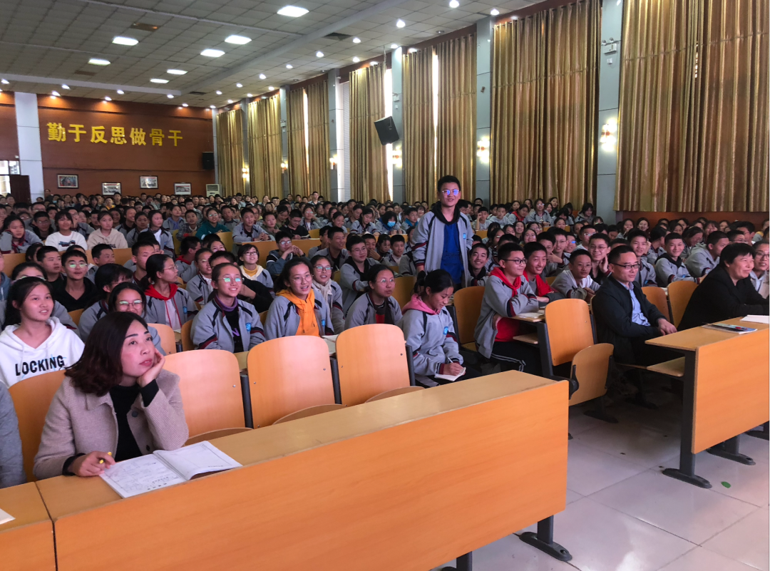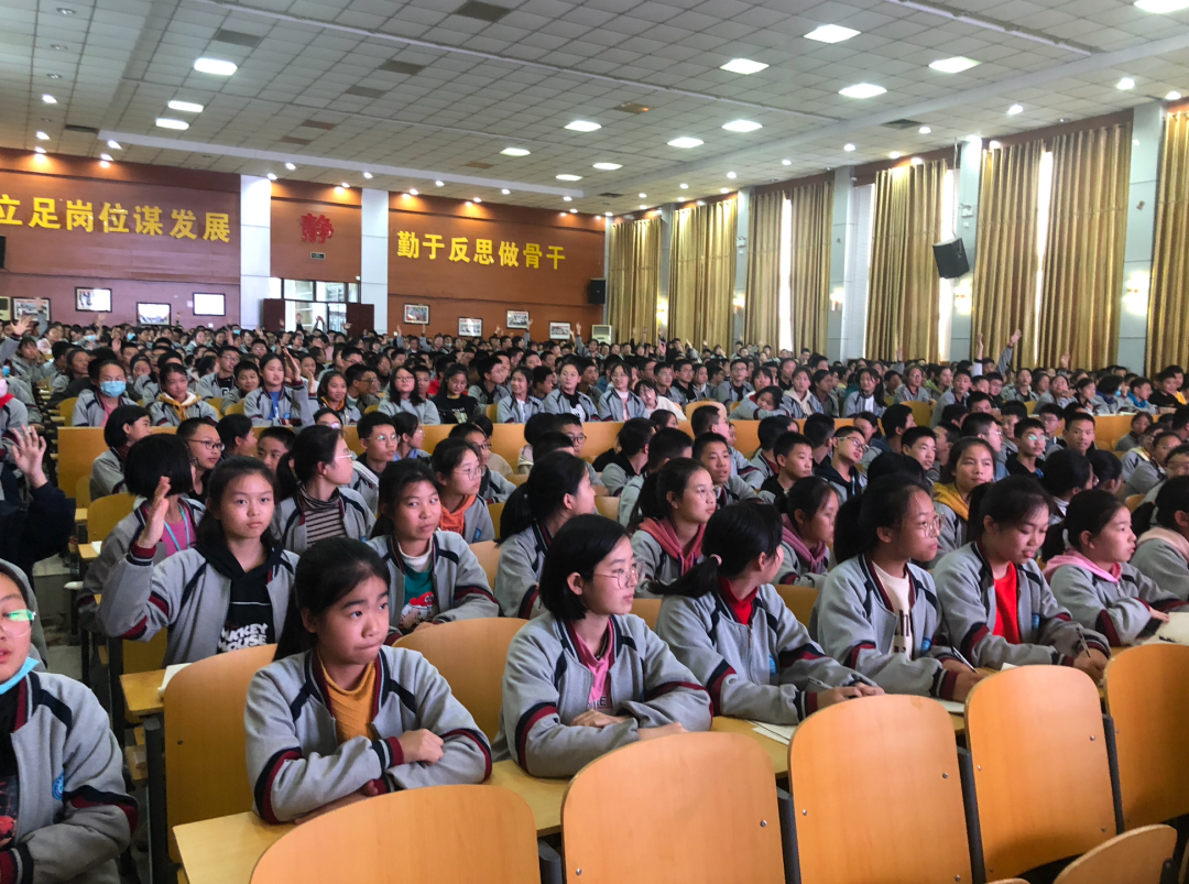 从淮阳中学离开,未来公益赶到河南省陈州中学。此刻已是学校放学时间,走进会场,这一幕让我们为之感动。数百名学生已经到处,受场地限制,部分同学没有座位,他们带着椅子挤在过道中,后排也站满了学生。
