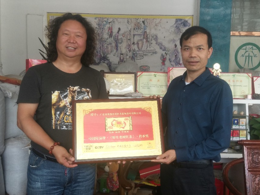 中国民企春晚执行导演赵方旭(左)与德福缘茶业董事长孙继成合影,”中国好品牌《野生老树红茶》传承奖“