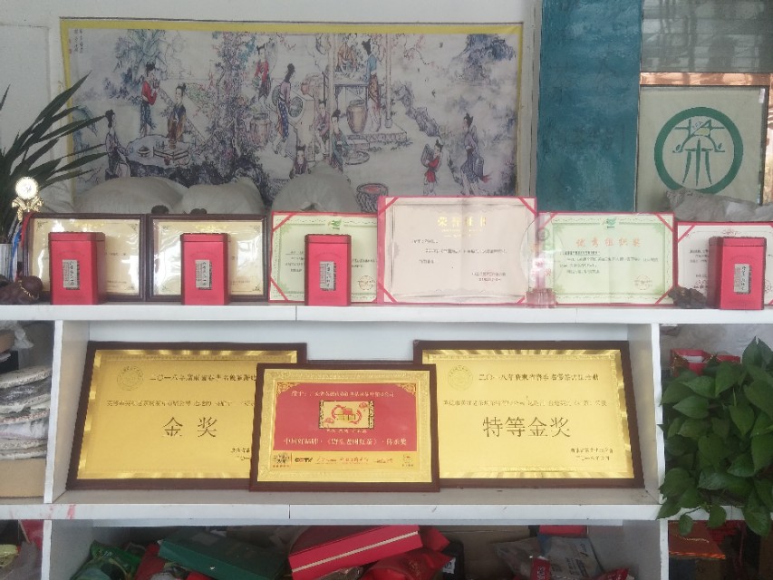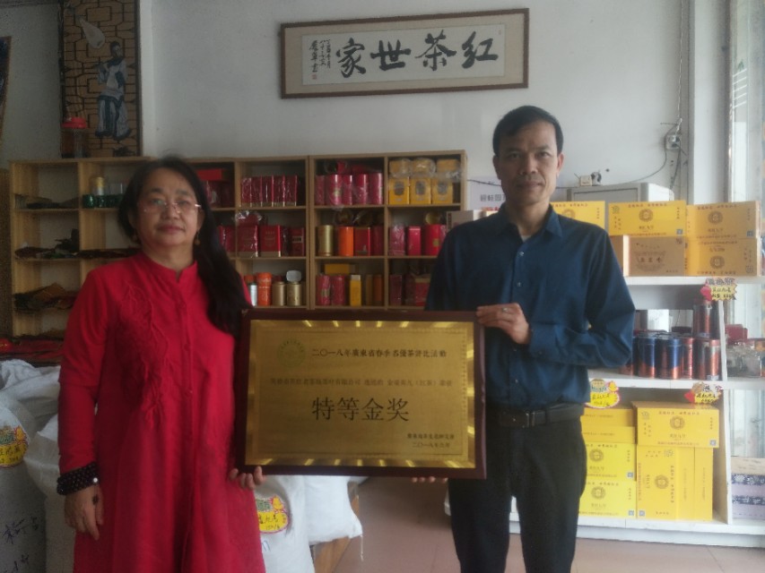 德福缘茶业董事长孙继成(右)与中国民企春晚摄制组、国家一级美术师罗凤书女士合影(左),2018年广东省春季名优茶评比获取特等金奖