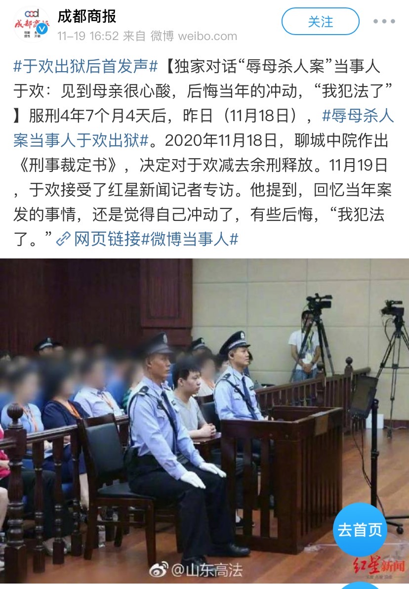 因为在服刑期间表现良好,2020年11月18日,于欢提前恢复了自由。