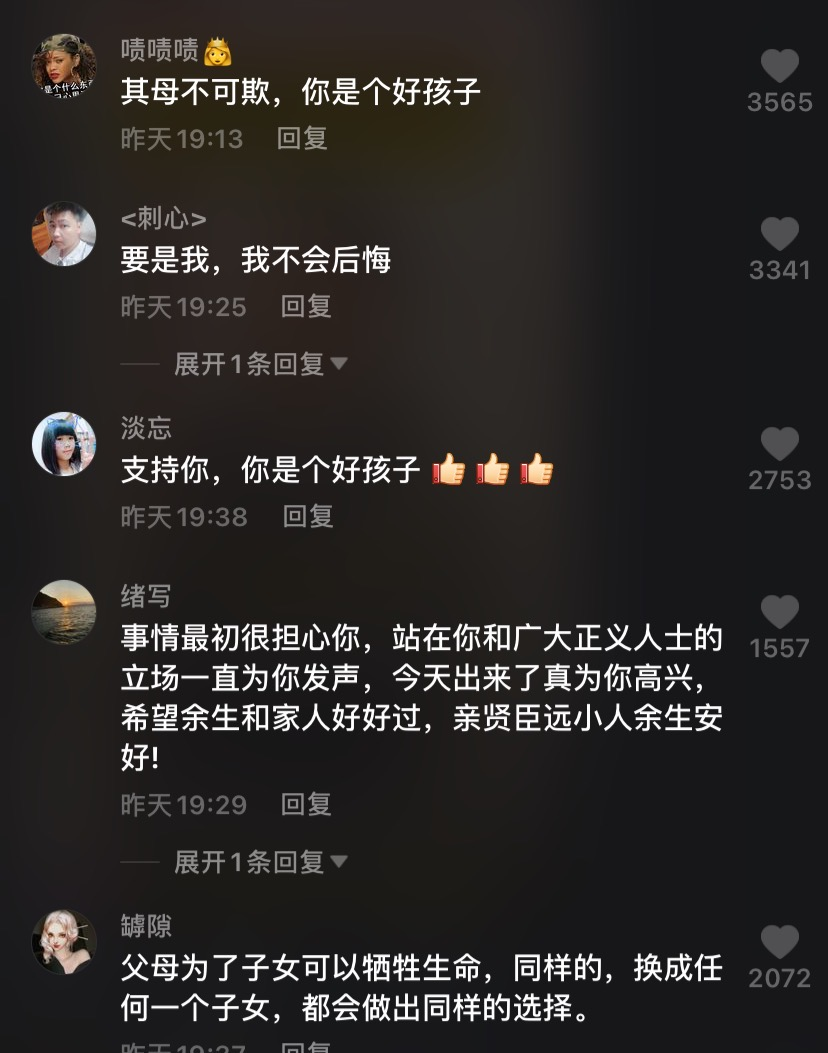 评论里,有网友这样回复他:其母不可欺,你是个好孩子。