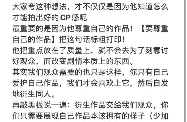 导演可以拍出cp感,但他更坚持尊重自己的作品,电视剧的重点还是在质量上,不会为了一些无关紧要的cp感而迎合观众口味改变整部剧的拍摄方式,尤其是这种衍生翻拍作品,他更会慎重对待。