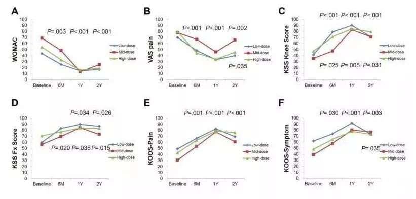有意思的是,中低剂量组(细胞量:1.0 x 10^7, 5.0 x 10^7)的临床改善在1年后趋于退化,只有高剂量组(细胞量:1.0 x 10^8)在2年内的临床改善有统计学意义。本次研究再次说明:临床结果与注射的自体间充质干细胞数量密切相关。