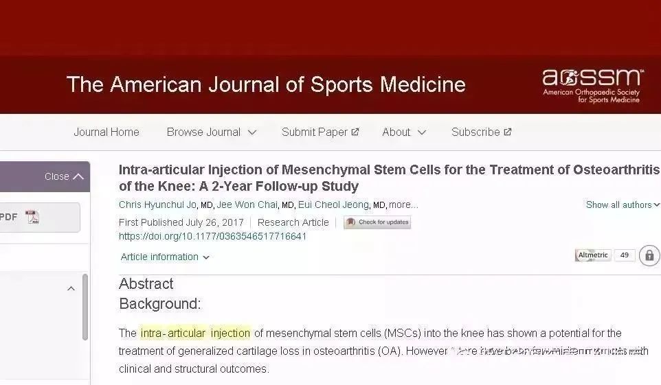 2017年10月,《美国运动医学杂志》刊发了Chris Hyunchul Jo 等韩国学者的一篇文章。结果表明,在2年时间内,关节腔注射自体间充质干细胞治疗膝关节炎安全、有效。
