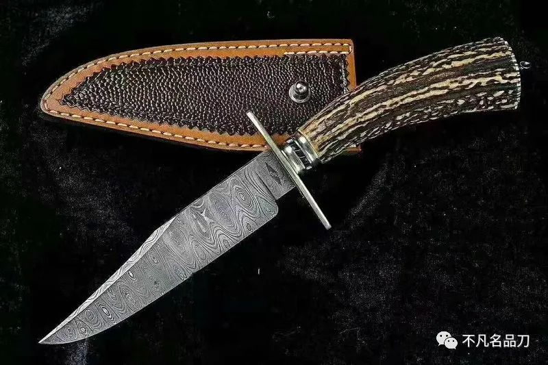 全长:278mm 刃长:143mm 刃宽:29mm 刃厚:5.2mm 刃材:大马士革 硬度:58-60 表面处理:酸洗刃面 龙骨:直杆 柄材:鹿角 皮鞘 产地:美国
