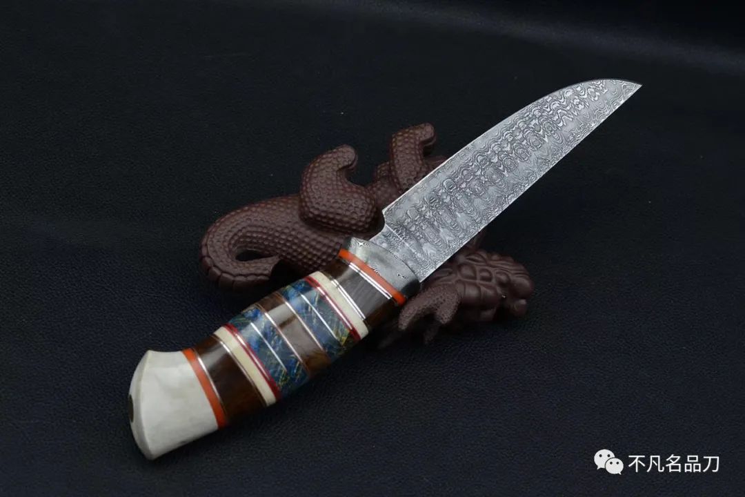 全长:255MM,刃长:130MM,柄长:125MM,刃度:32MM,厚度:4.3MM,钢材:锻造大马士革钢,硬度:60左右 ,柄材:稳定化木榴+鹿角+沙漠铁木,护手:大马士革钢