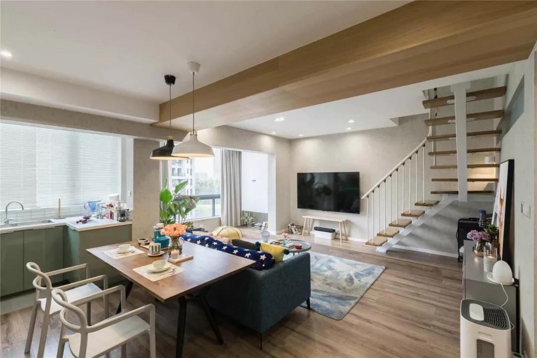 一楼的设计把厨房客厅和阳台全部打通,厨房为开放式厨房,客厅的沙发背靠餐桌,餐桌上方一黑一白两盏吊灯,即有照明作用,也起到装饰点缀的作用。