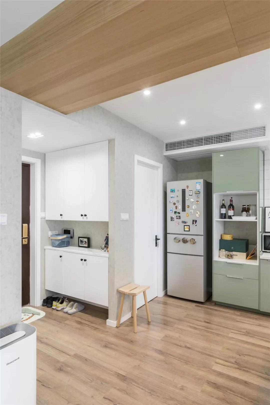 在入户玄关的一侧做了到顶的白色嵌入式鞋柜,为了方便回家放钥匙包等杂物,特地在中间做留空设计,鞋柜的底部也留空,换下来的鞋子放底下,不占用过道空间。