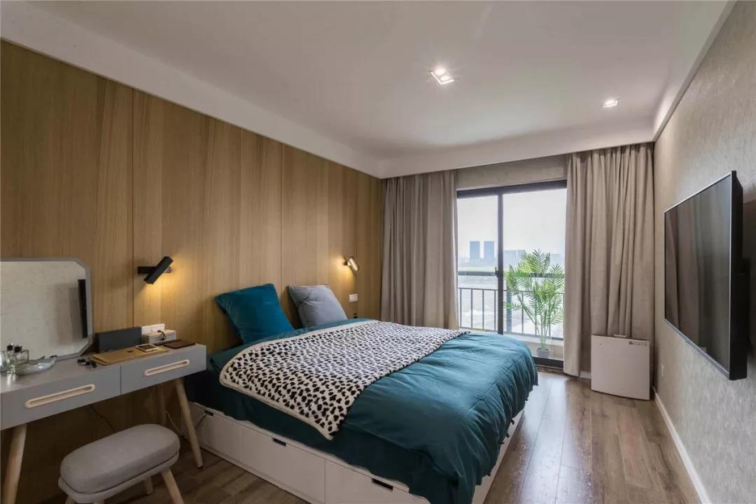 主卧的床头背景墙以木饰面板装饰,电视背景墙则以灰色的壁纸装饰。
