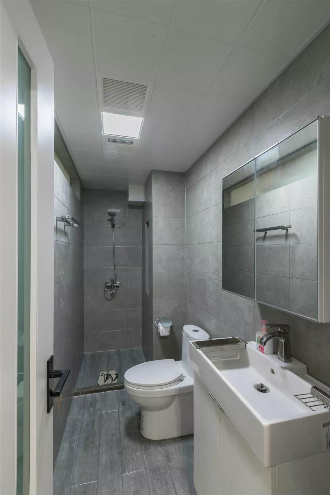 卫生间属于狭长型,最里面设为淋浴区,在墙面上开的可以放洗漱用品壁龛,地面挡水条防止洗澡的水流的满卫生间都是。
