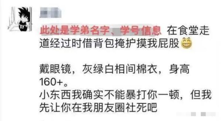 学弟当即表示不满,说可以调监控来证明清白,但唐靖沉浸在自己的想象中,一口咬定是咸猪手,回到寝室之后又发了一条朋友圈,上面直接展示了学弟的姓名和学号,用了“小东西”和“社死”等恶毒的词语,在未经证实的情况下擅自将学弟隐私曝光。