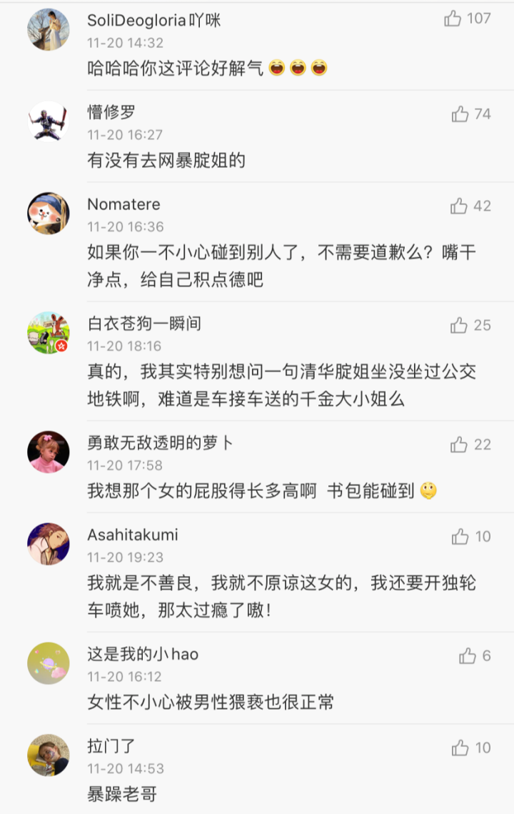 我还问到了对方的颜值跟女生的反应有没有关联,女性普遍表示如果被帅哥碰到了,厌恶感会减轻,但这种不悦还是会存在,只是不至于闹事,如果被一个丑屌碰到了,厌恶感会大大提高,得理不饶人的情况就会出现。