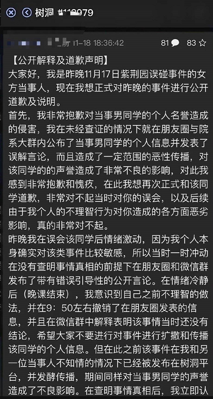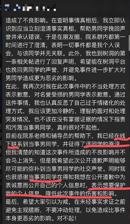好在情绪平复之后,唐靖去清华树洞发了一则声明,文中以道歉的方式对学弟的声誉进行了恢复,相比之前的傲慢和偏见,这一次的声明看上去还不错,算是她做得最正确的一件事。