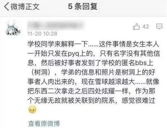 这些内容传开之后,好事者在网上大举辱骂学弟,清华同学在树洞里展开了激烈讨论,而网络上第一次发酵时的情形是这样的,跟现在的画风大相径庭。