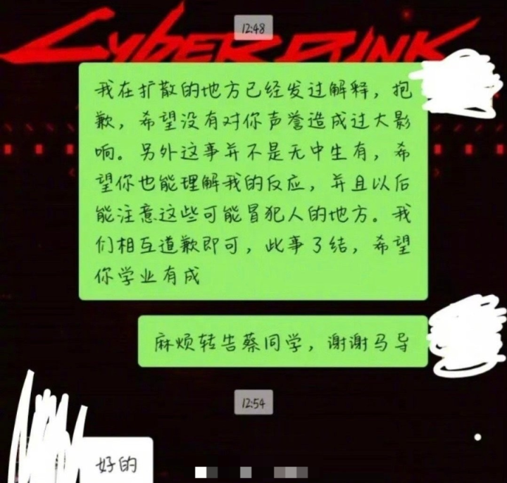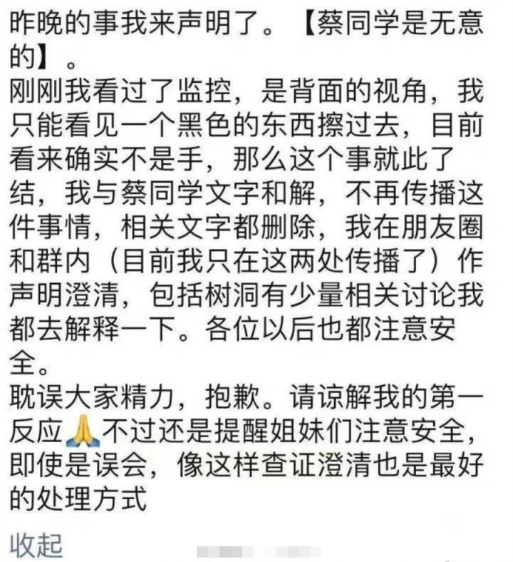 在朋友圈的声明中,唐靖单方面宣布此事了结,她淡化了自己的过错,随后找辅导员转告学弟。