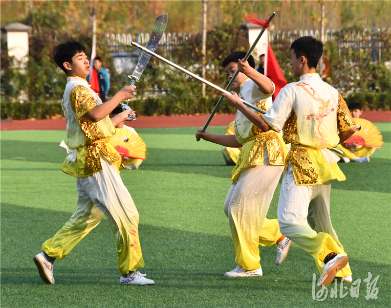 2020年11月19日,在河北省邯郸市永年区洺州中学,学生们正在进行武术项目展示。