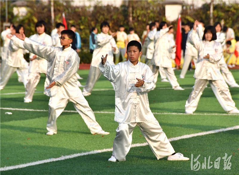 2020年11月19日,在河北省邯郸市永年区洺州中学,学生们正在进行太极拳项目展示。