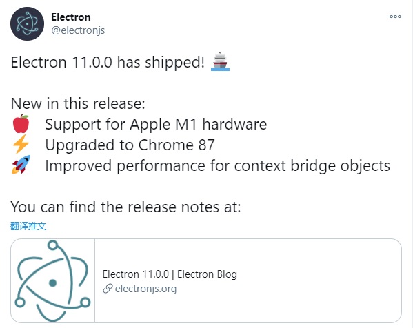 近期,苹果发布了M1芯片及新款MacBook Air、MacBook Pro 13和Mac mini,不少软件应用已经适配了苹果 silicon 平台。现在Electron官方发布了Electron 11.0.0,宣布支持苹果M1硬件,升级至Chrome 87,并提高了context bridge objects性能。