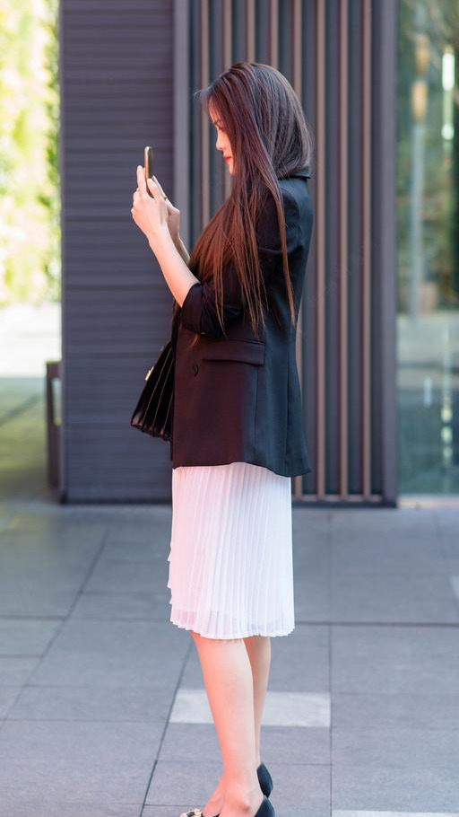 看下照片中的这个美女,她就采用了西装加百褶裙的搭配方式,是不是给人一种非常精致的感觉。一件有正式感的黑色西装,里面搭配一件黑色低胸吊带衫,这样搭配显得优雅又性感。美女下身穿一条白色百褶裙,裙子的长度刚好在膝盖位置,搭配一双黑色尖头细跟鞋,露出一双纤细匀称的小腿。一头靓丽的秀发自然地散落下来,略施脂粉展现了精致感十足的职业女性气质。