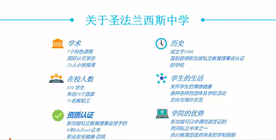 圣法兰西斯学校创立于1960年,圣法兰西斯卫理公会教会学校(SFMS)是新加坡的顶尖私立学校之一。学校每年招收约600名来自新加坡及包括 中国 、越南、泰国、印度尼西亚、缅甸及日韩在内20多个其他国家的中学生及大学预科生,并为学生的不同学习需求提供不同的学术途径。