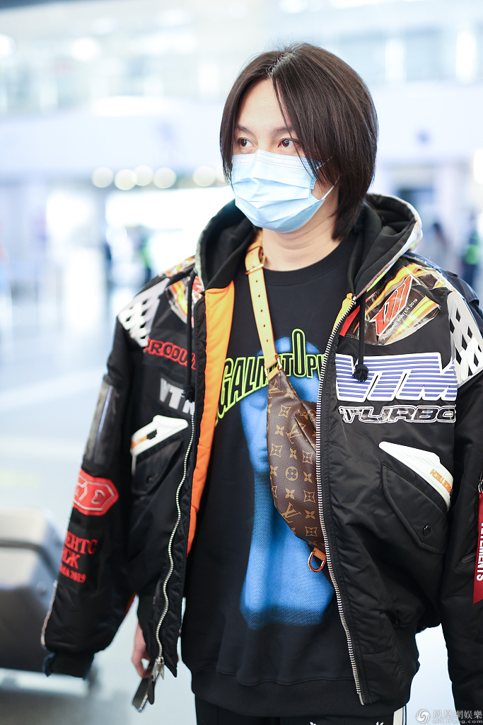 尹正穿贴画外套搭配黑色长裤 胸前背小包造型潮酷