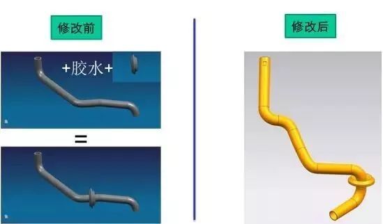 一个水管的原先设计是胶管挤出,再装配一个闷头,需要涂胶水。操作工可能会漏涂胶水、多涂胶水、装错了闷头的方向和位置,甚至于忘记装闷头。这个制造可行性是很差的。