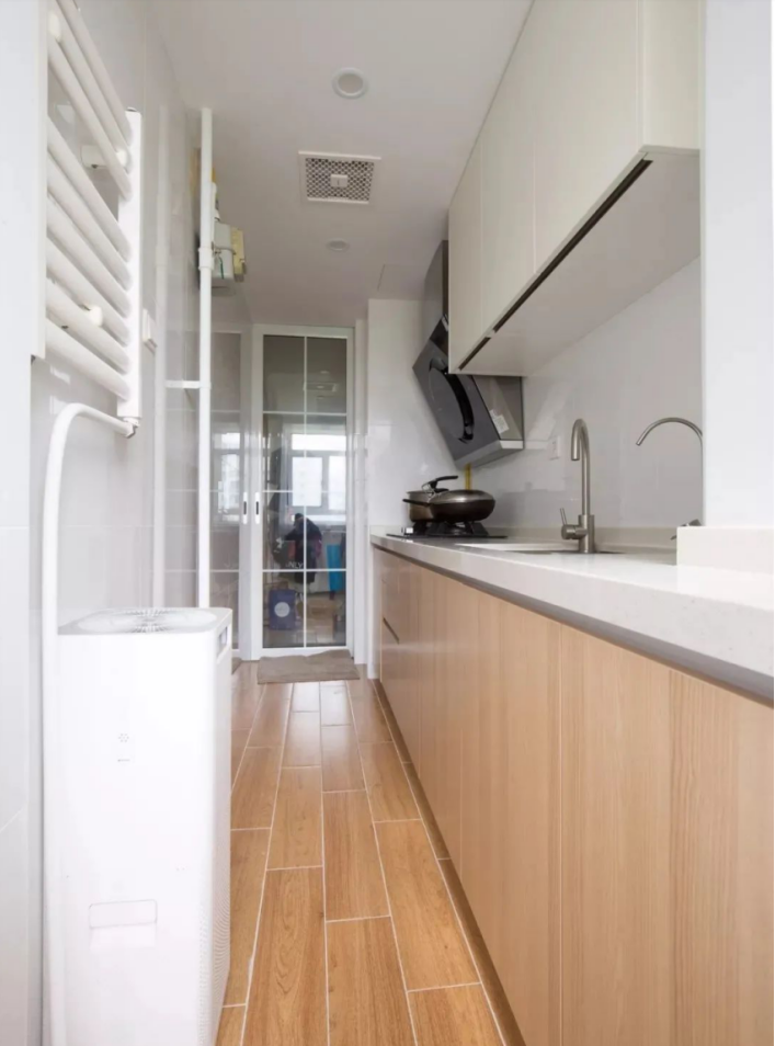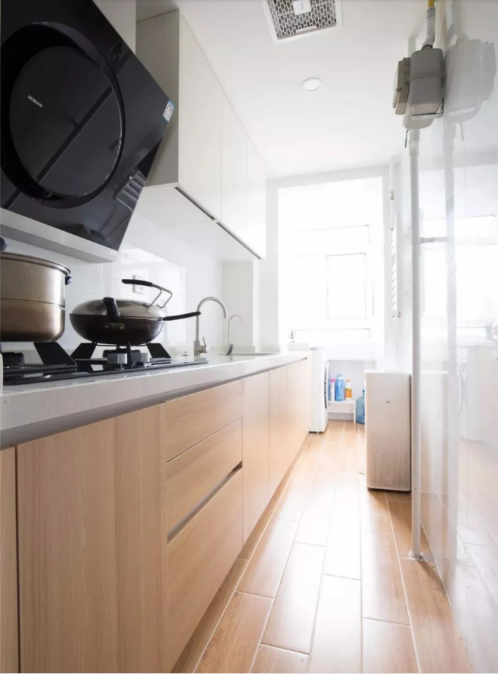 一字型的厨房就是长而已,木色的橱柜搭配上白色的吊柜,让整个厨房看上去也有简洁舒适的效果。
