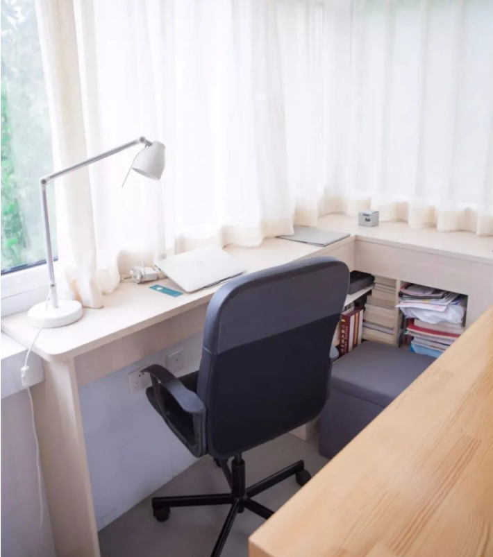 卧室旁边还有一个阳台,除了作为平时的晾晒之外,在另外一端还做了书桌柜。一个简单的书房工作区就产生了,这样就算在家里办公也不是什么问题了。
