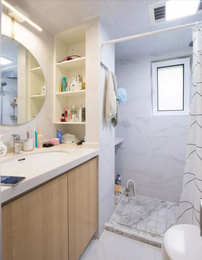 卫生间的面积并不大,但还在用浴帘和挡水条也能做到干湿分离。加上洗漱柜和壁龛之类的收纳设计,这样一来也就不缺储物空间了。