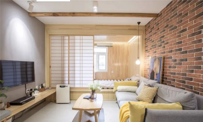 浅灰色的电视背景墙和简单的家具布置,让整个客厅的视觉效果也挺舒适美观。旁边的是原本客厅的阳台,做成了一个备用的卧室,用日式的格栅门做隔断,这样还挺有原木风的感觉。