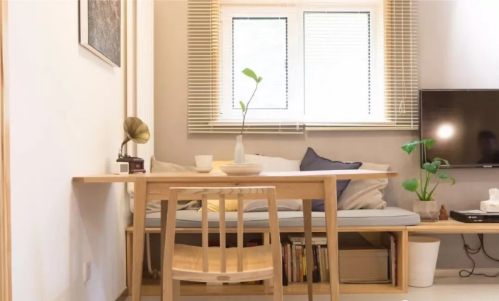 餐厅一边的餐椅是和电视柜一起的,样子就有点像卡座了,收纳就座都可以。简简单单的,看着也舒服,餐桌边还有一个窗户,视觉效果也很广。