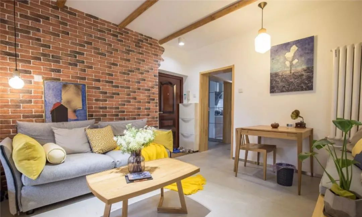 玄关的空间不大,所以想要现场制作一个鞋柜就不太可能了,买一个薄款的鞋柜就可以基本满足日常的所需了。过来一点就是餐厅和客厅,客厅是用红砖墙,效果也很有个性的。