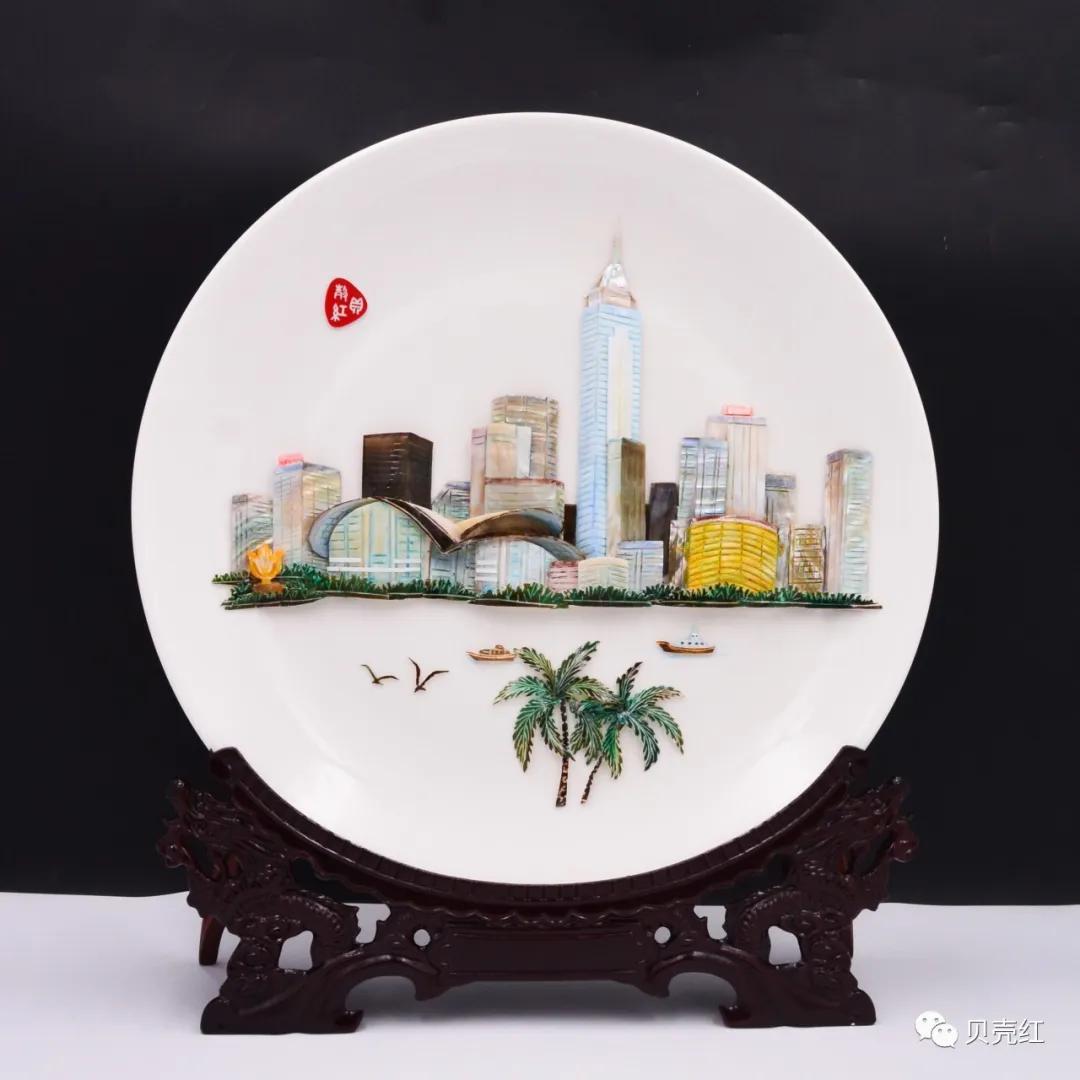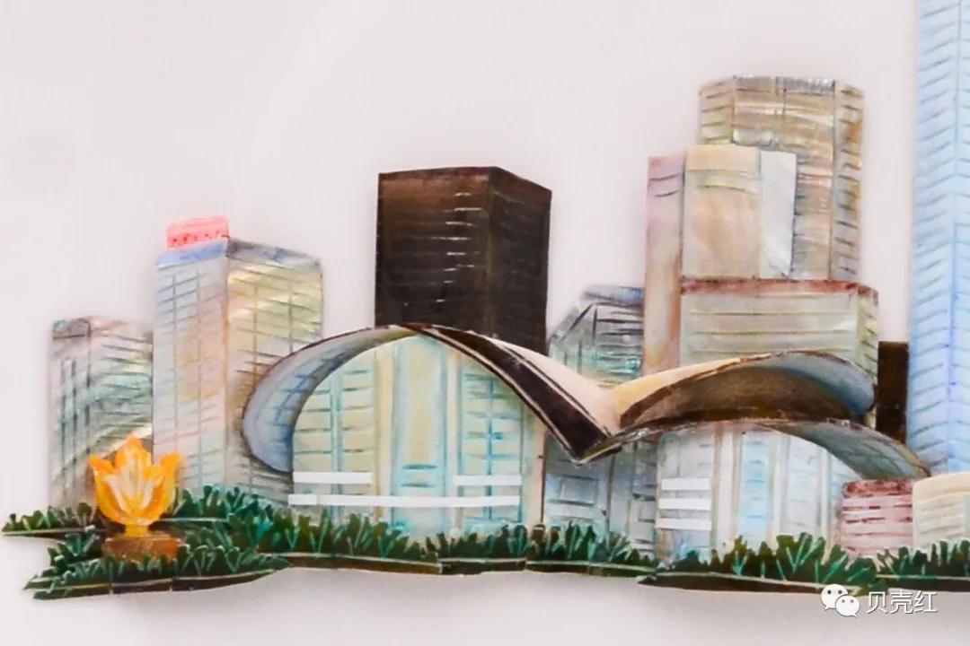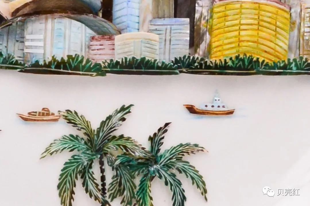 贝壳红贝雕《维多利亚港》,精选珍贵贝壳,纯手工精心打造,刻画维多利亚港两岸高楼林立,繁忙的渡海小轮穿梭于南北两岸之间,交织出一幅繁华与共的都市海景。