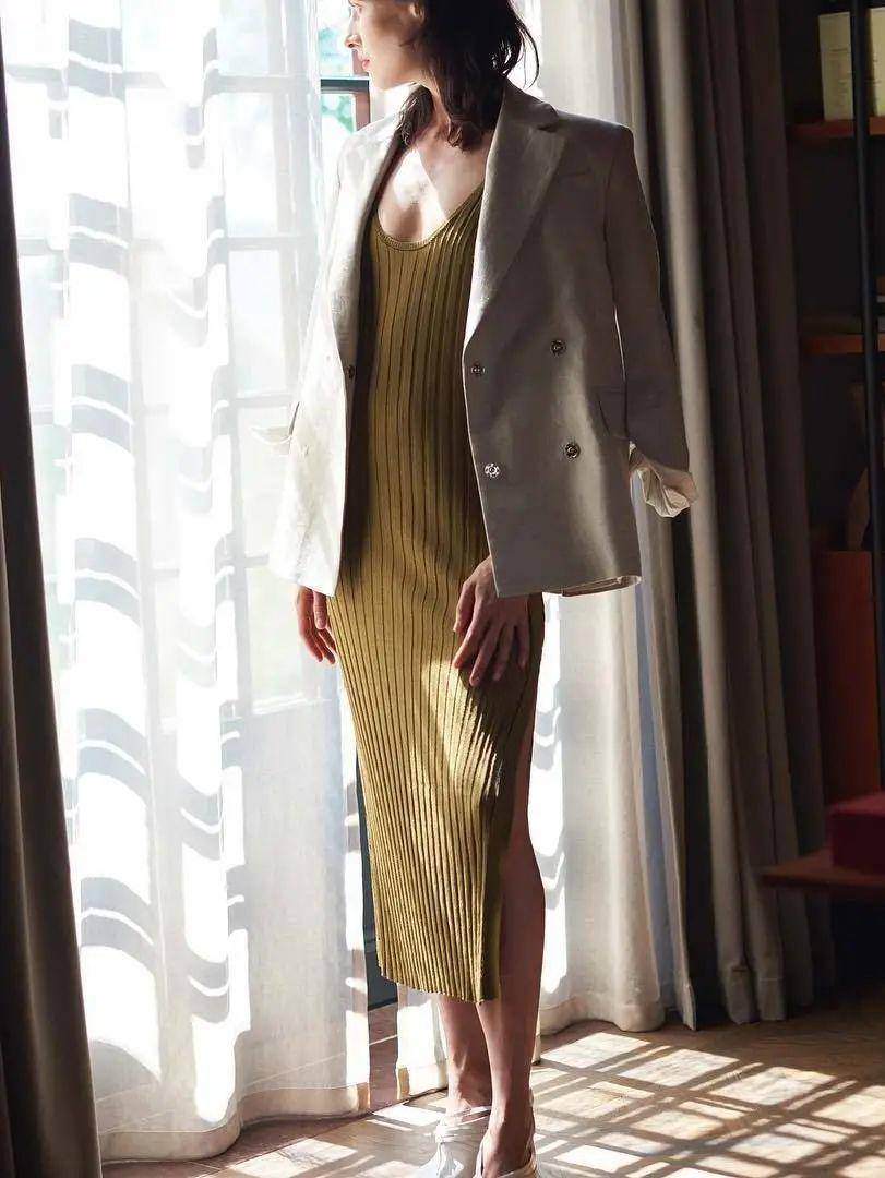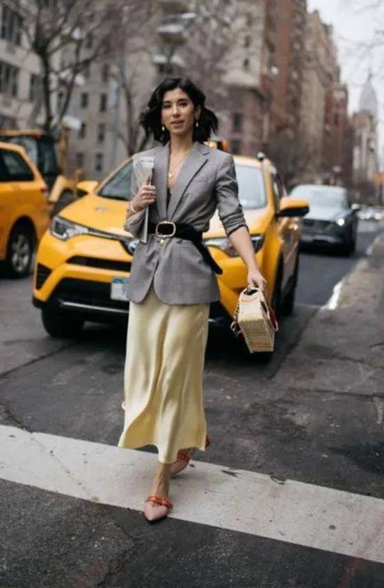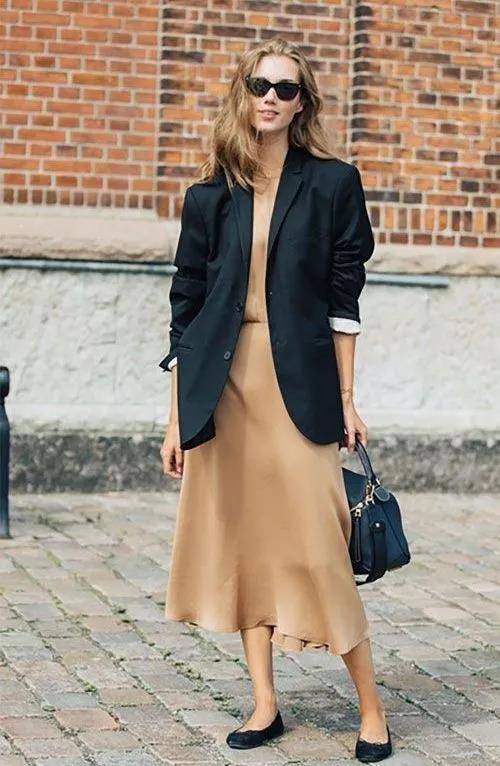 初秋时,微薄的丝绸长裙搭配上稍正式的西服外套,背上心爱的包包,就是一套超级时尚的百搭造型了。