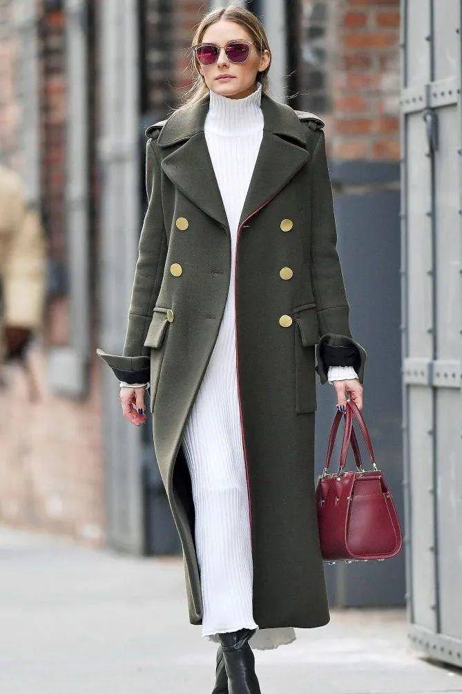 纯Black的搭配高级感满满,既干净利落,又时尚感爆棚;白色内搭配上绿色长大衣,风度满满又格外保暖,实用性极强。