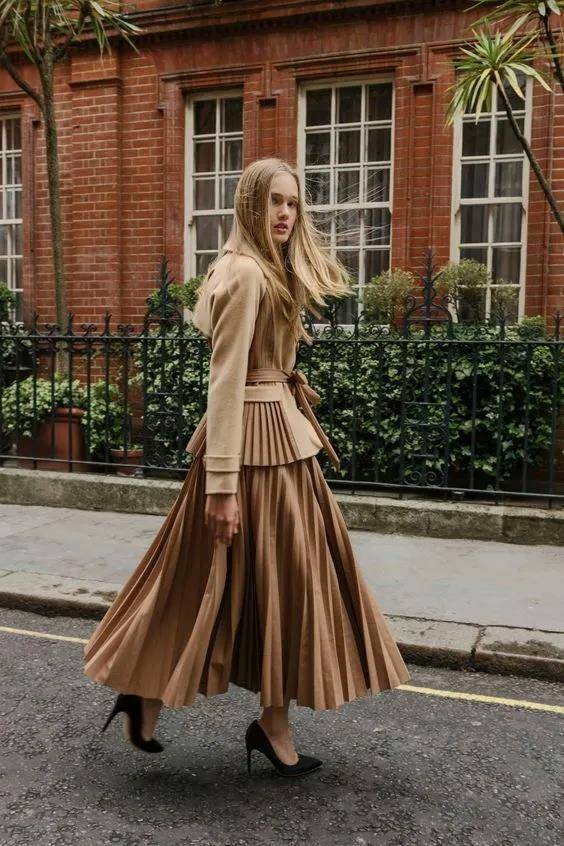 不喜欢长裙紧贴小腿的朋友也可以考虑百褶长裙,足够宽大的裙摆,能够承载更多巧妙的设计,也是秋冬季节日常搭配的神仙单品,简直不要太受欢迎。