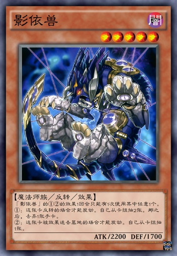 效果·反转:影依兽的①②的效果1回合只能有1次使用其中任意1个。 ①这张卡反转的场合才能发动。自己从卡组抽2张。那之后,丢弃1张手卡。 ②这张卡被效果送去墓地的场合才能发动。自己从卡组抽1张。