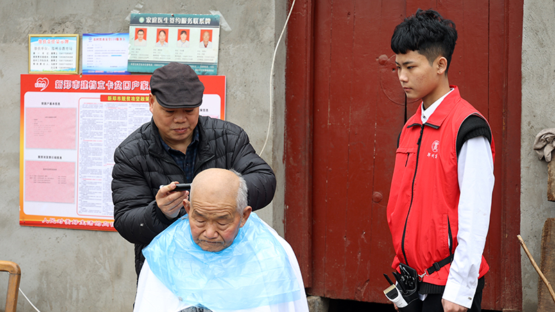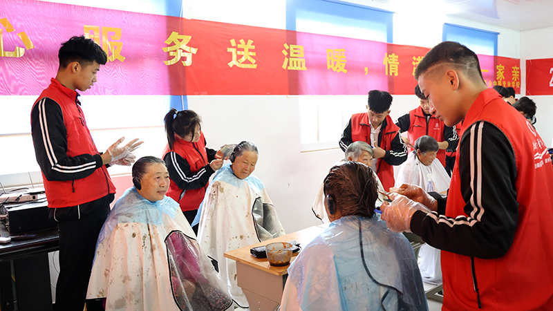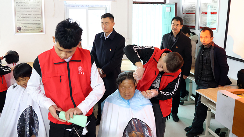 电推剪嗡嗡低鸣、手工剪开合利落……为深入贯彻落实党的十九大精神,大力弘扬中华民族“尊老敬老”的传统美德,11月21日,在学校党支部书记赵红军、校长王景辉的带领下,形象设计系的19名学生来到了新郑市辛店镇王庄村开展“关爱长者·爱心义剪”志愿服务活动,利用所学专业知识为村里老人们义务剪发。