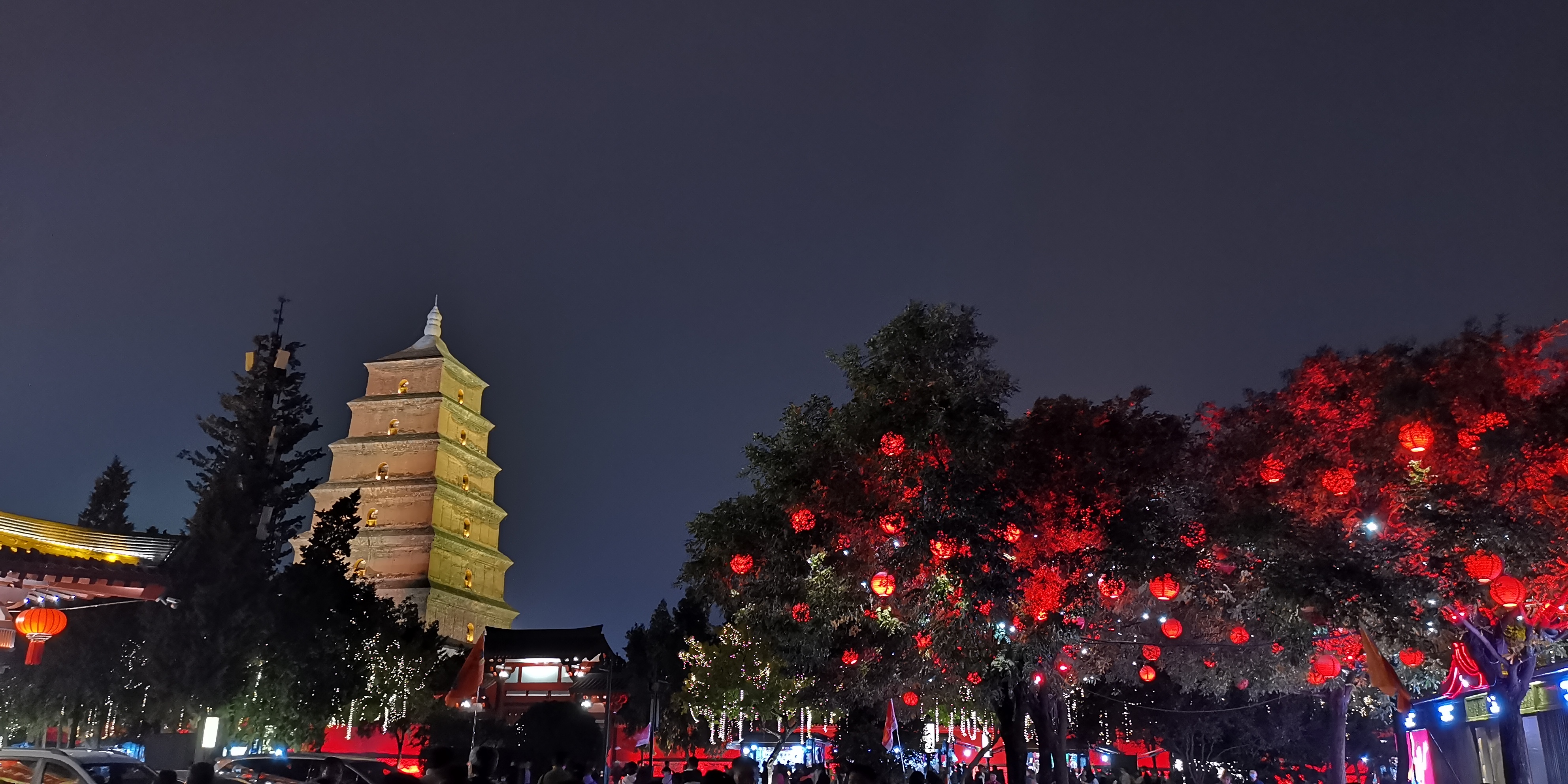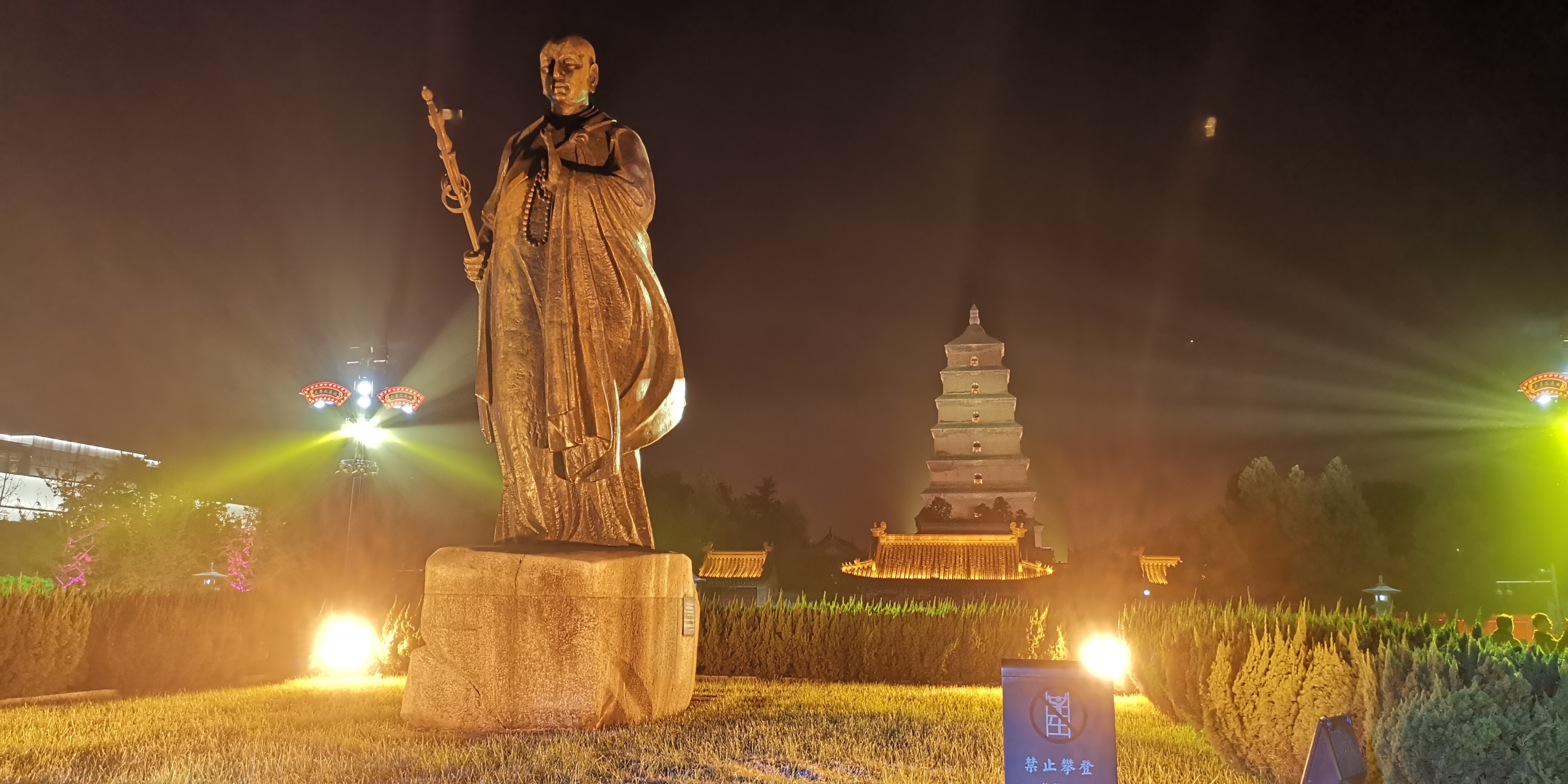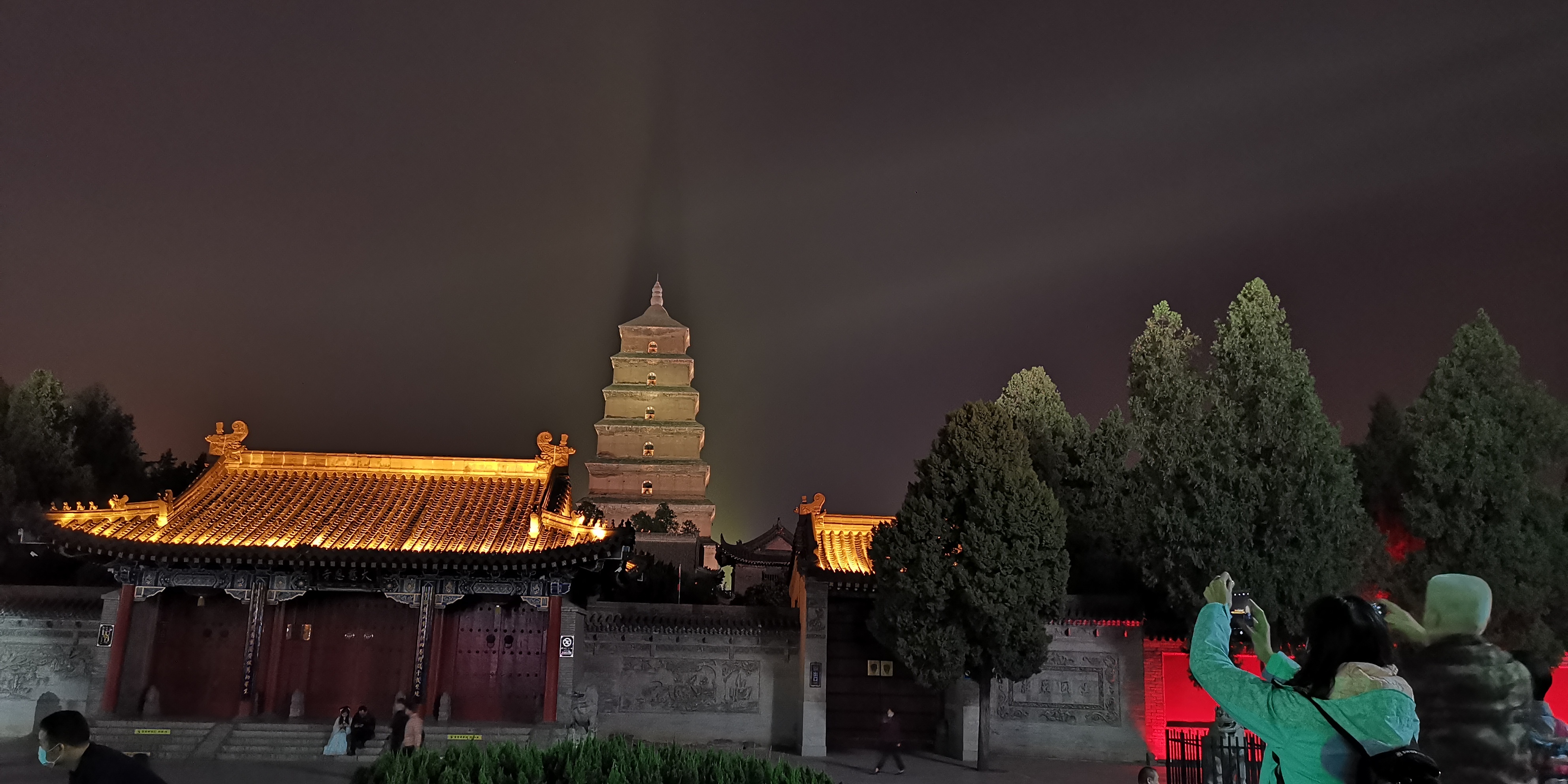 华灯初上的夜晚,来到雁塔区大雁塔脚下。全国示范步行街的街区中轴北起大雁塔南广场,纵贯两千多米向南至唐城墙遗址,总建筑面积达六十多万平方米。不夜城以盛唐文化为背景,以唐风元素为主线,展现了以唐太宗李世民(贞观之治)、唐玄宗李隆基(开元盛世)、一代女皇武则天,西行天竺求法高僧玄奘(陈祎)、东渡日本弘布戒律鉴真(淳于)和尚等一代帝王、历史人物为主题的千年古都历史文脉和文化轴线,凸显西安的城市精神和文化意象。