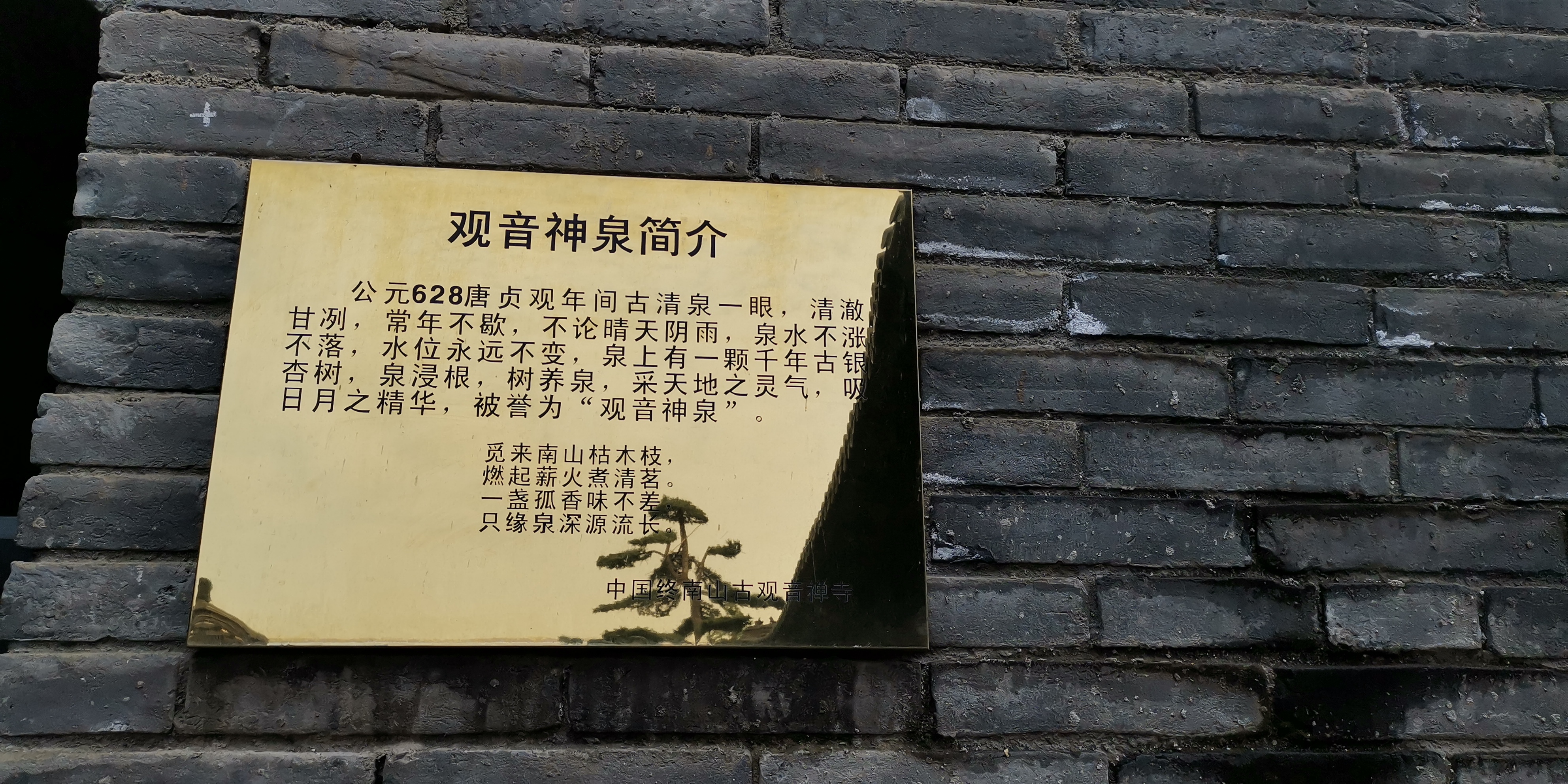 寺中有古清泉一眼,清澈甘冽,常年不歇,不论晴天阴雨,泉水不涨不落,水位永远不变;泉上有一棵千年古银杏树,泉浸根,树养泉,采天地之灵气,吸日月之精华,被誉为"观音神泉"。据传这棵银杏树是当年唐太宗李世民亲手栽种,现已被列为国家古树名木保护名录。凝视着神泉、神树,似乎在沧桑岁月的古观音禅寺中入定了……这是对心灵的抚慰,也是一次精神世界的洗礼。……
