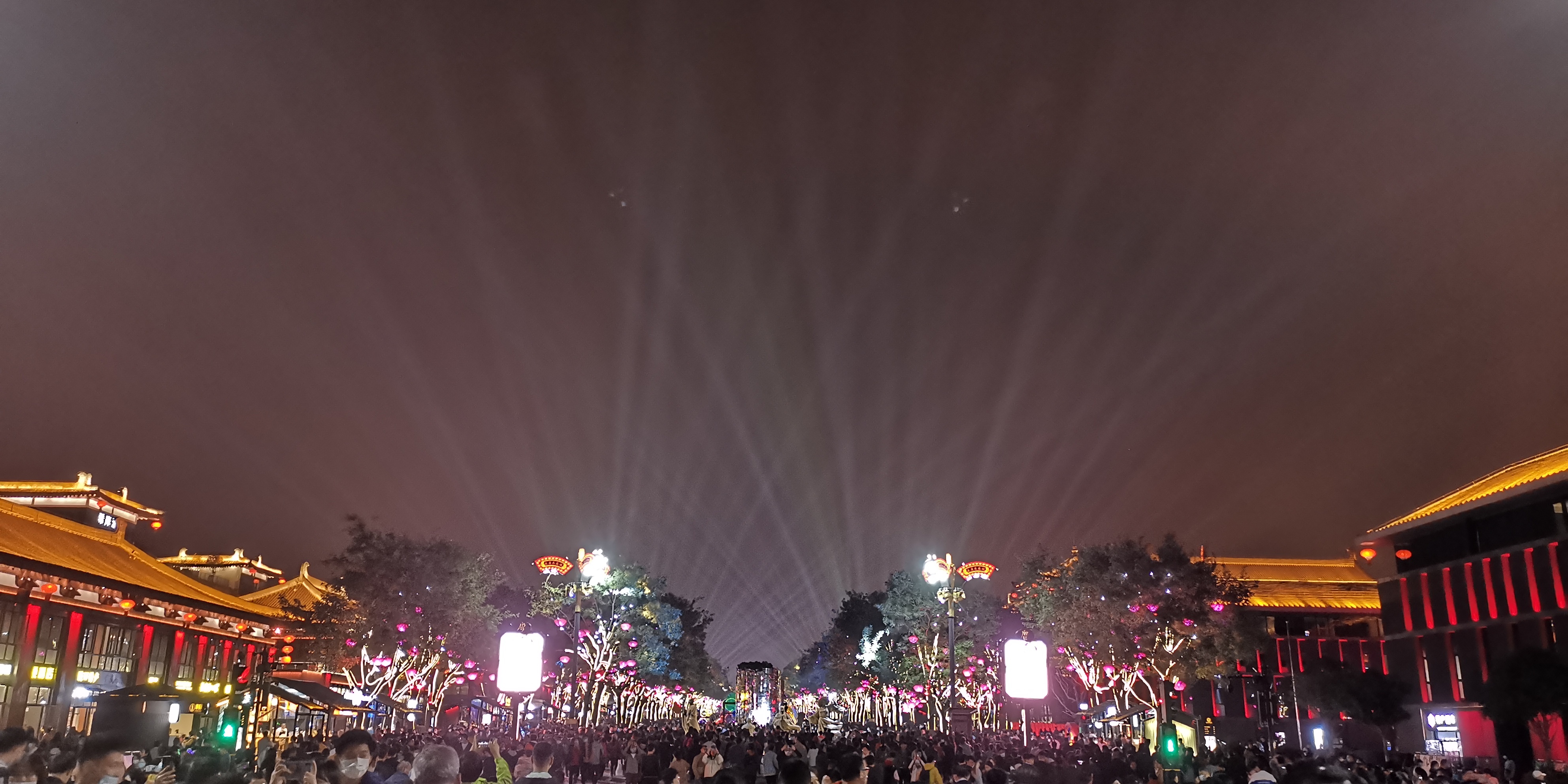 徜徉于这条开发最佳的大唐不夜城旅游景区,感觉这是一场视觉的盛宴,十三朝古都历史云烟依旧弥漫,不夜城独领风骚极尽豪奢:灯火璀璨,恍若白昼,火树银花;喧嚣热闹,琳琅满目,商铺密集;人头攒动,摩肩接踵,游人如织;缤纷街市,一派祥和,景象繁华……