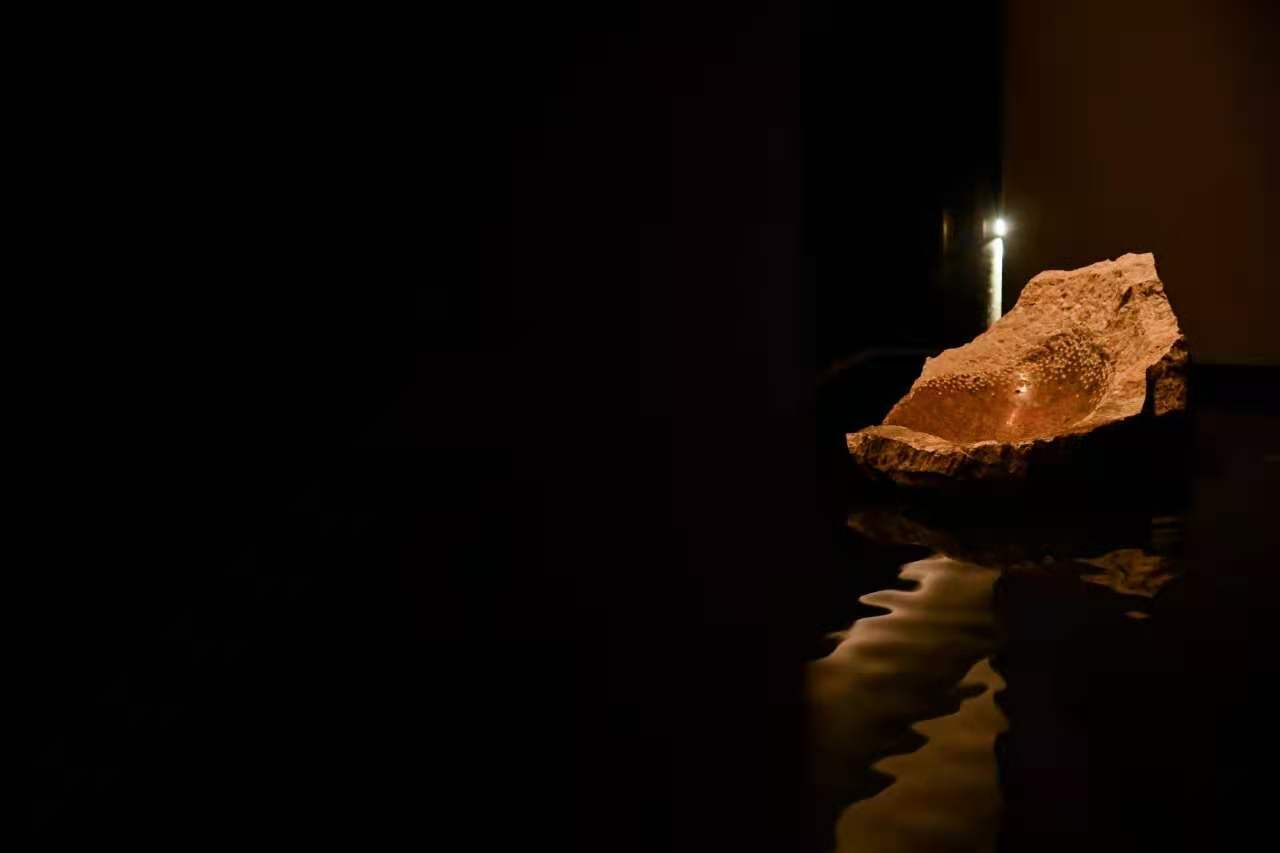 一层主入口旁的墙面用了混凝土砌块的垒砌交叠了亮面金属片,日光折射下呈现各种不确定性,夜晚通过灯光的渲染,呈现视觉的扩散。倒锥形的体块下端一碗“琉璃水”,水滴随着椎体缓缓滴下。