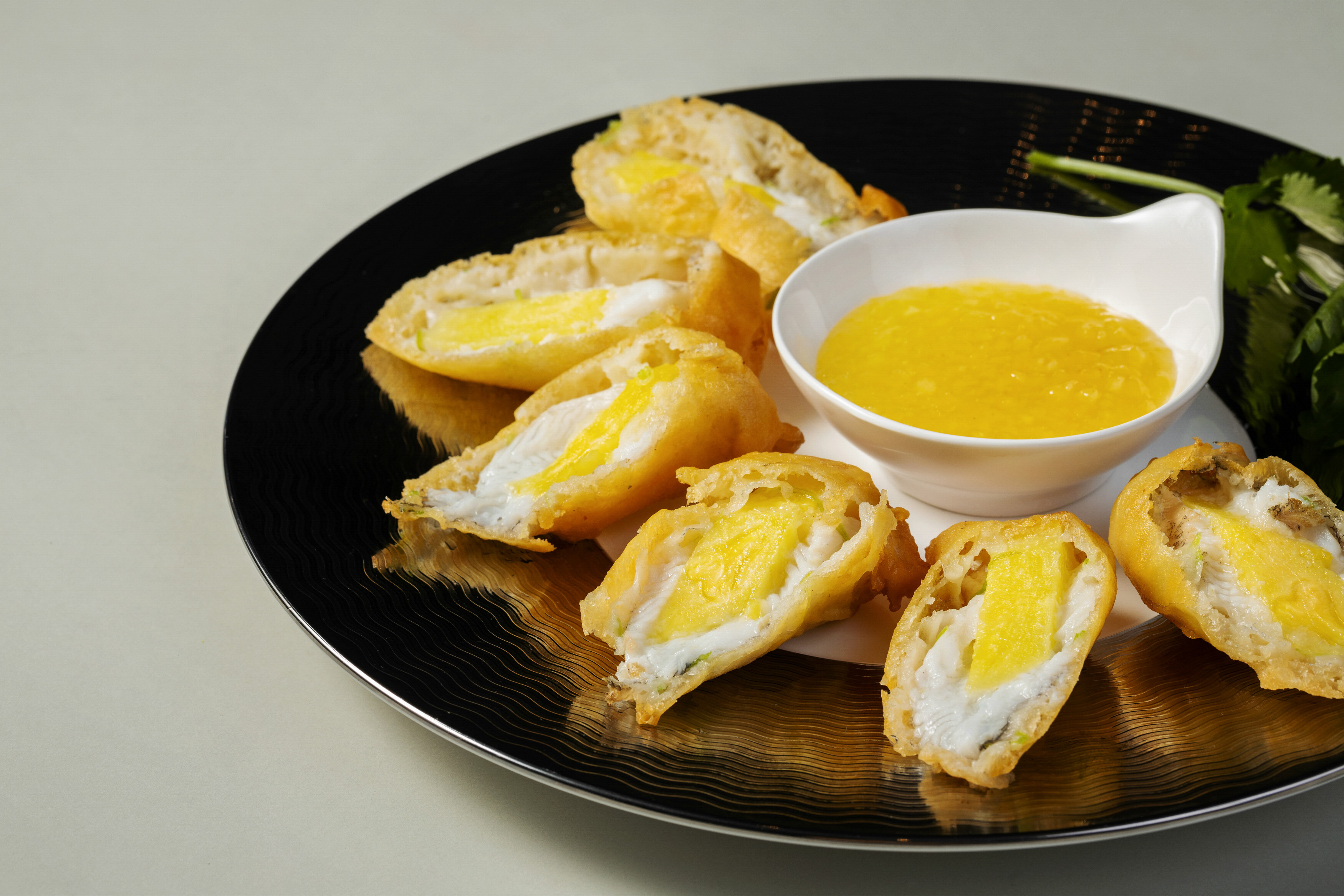 潮汕九肚鱼,别名豆腐鱼,细滑如豆腐,白里透红、肉质鲜嫩且水分含量多。有别于传统潮汕菜——菜脯九肚鱼的做法,「珍庭」主厨别出心裁,将九肚鱼与新鲜菠萝搭配,表面炸得金黄酥脆的九肚鱼,和黄澄澄的菠萝相得益彰,九肚鱼浑身柔软少骨、肉质鲜美,裹挟着一丝热带水果的酸味和香甜,十分可口。